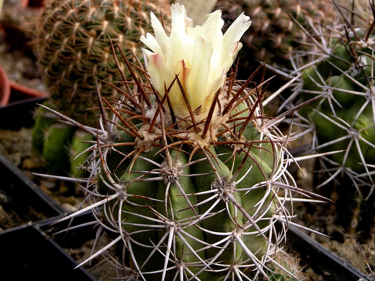 Priemer 60 mm, výška 50 mm, silné tŕne, žlté kvety, vrúbľovaná na Echinopsis, preto je ľahko pestovateľná. Viac informácie a pestovanie na: